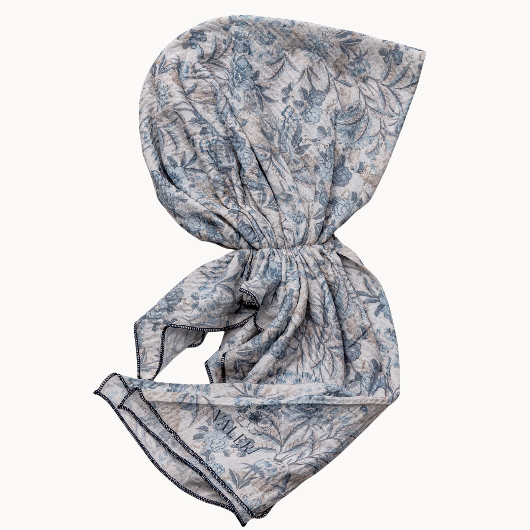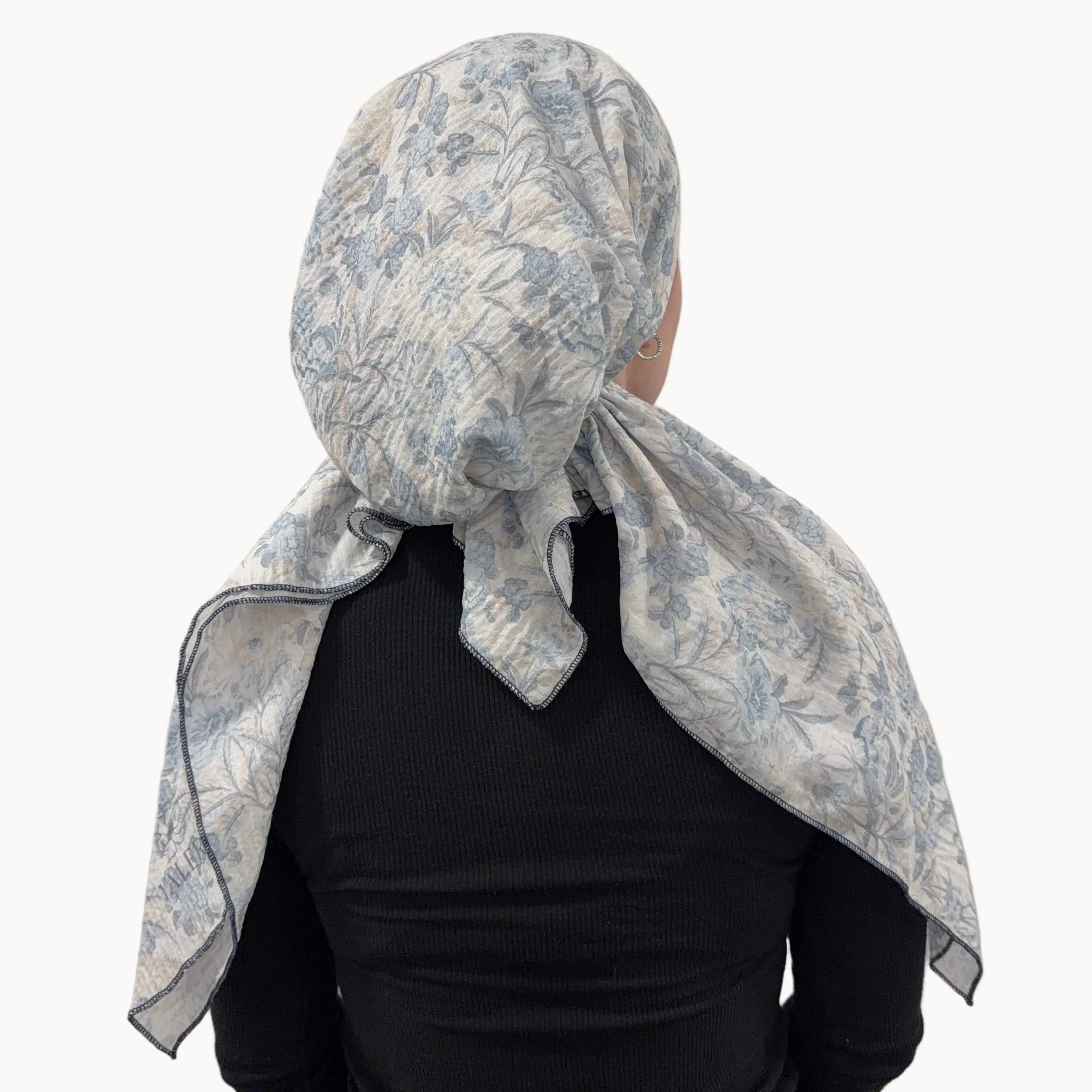 Soft powder blue and ivory garden florals in a delicate toile style on a white background. Made on our new airy crinkle fabric with just the right amount of texture. Comfortable, lightweight, and perfect for all seasons.