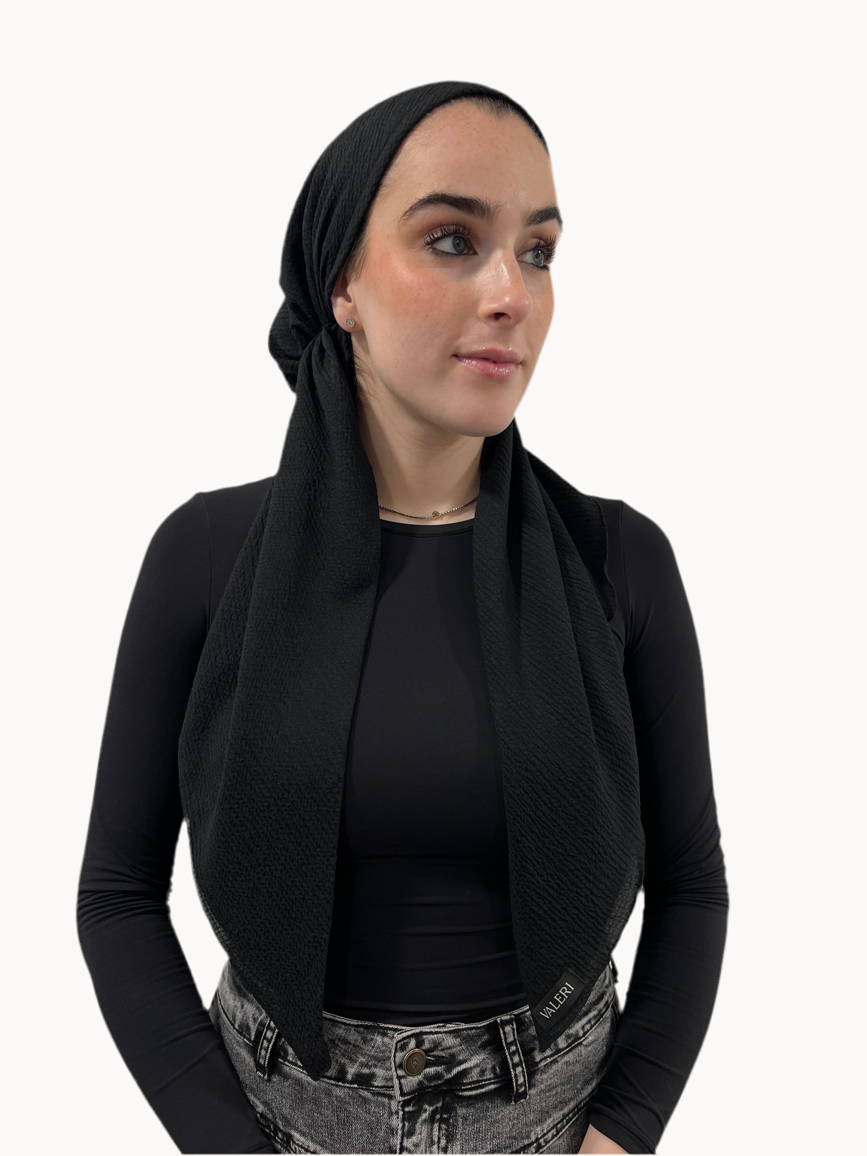Our community’s absolute favorite — and for good reason. This scarf is crafted from the softest crinkle-textured fabric that drapes beautifully and adds natural dimension around the face. Inside, we’ve sewn in our signature velvet headband for a secure, slip-free fit, plus an adjustable toggle so you can customize the sizing to your comfort.