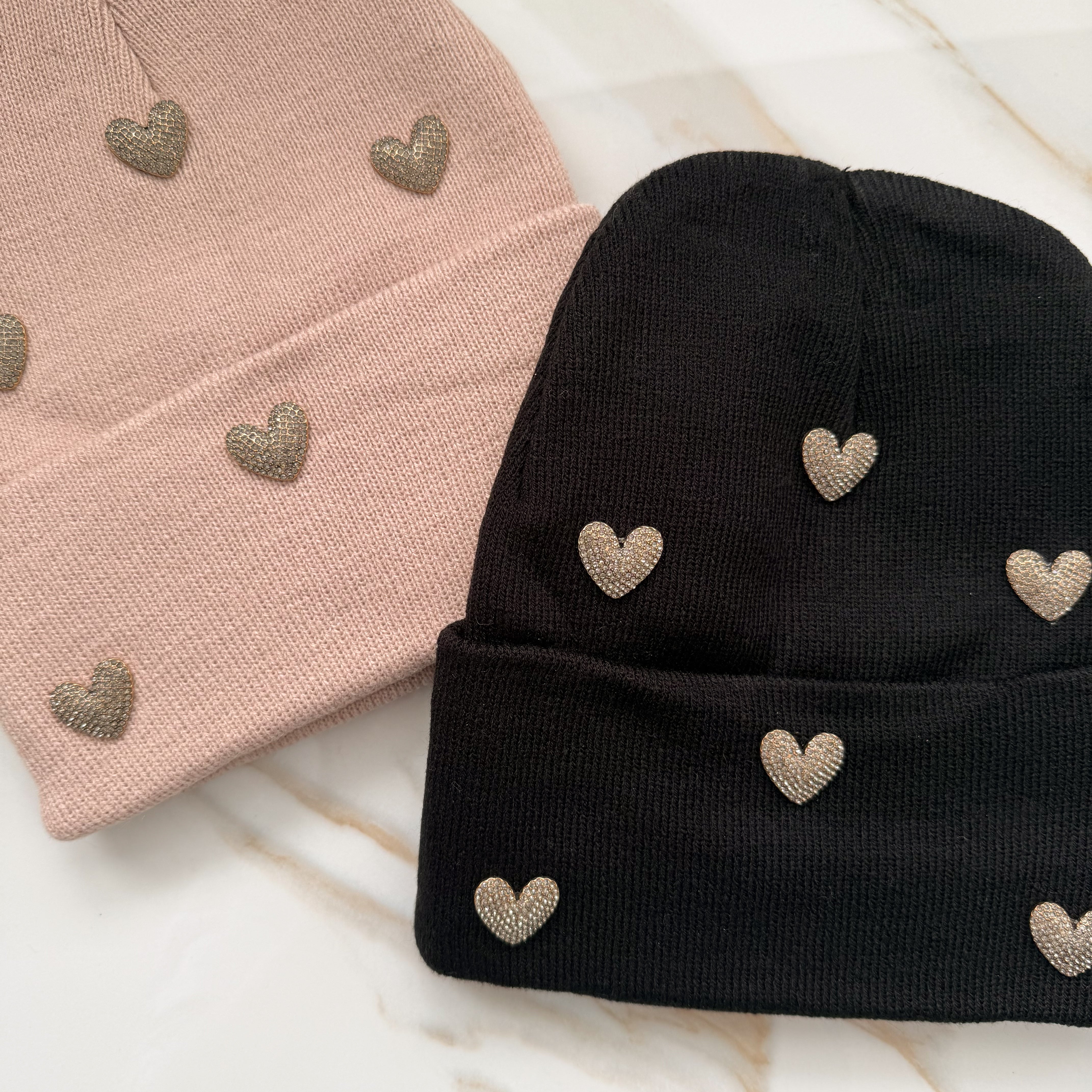 Limited edition hand embellished fitted cuff beanies with classy golden hearts.