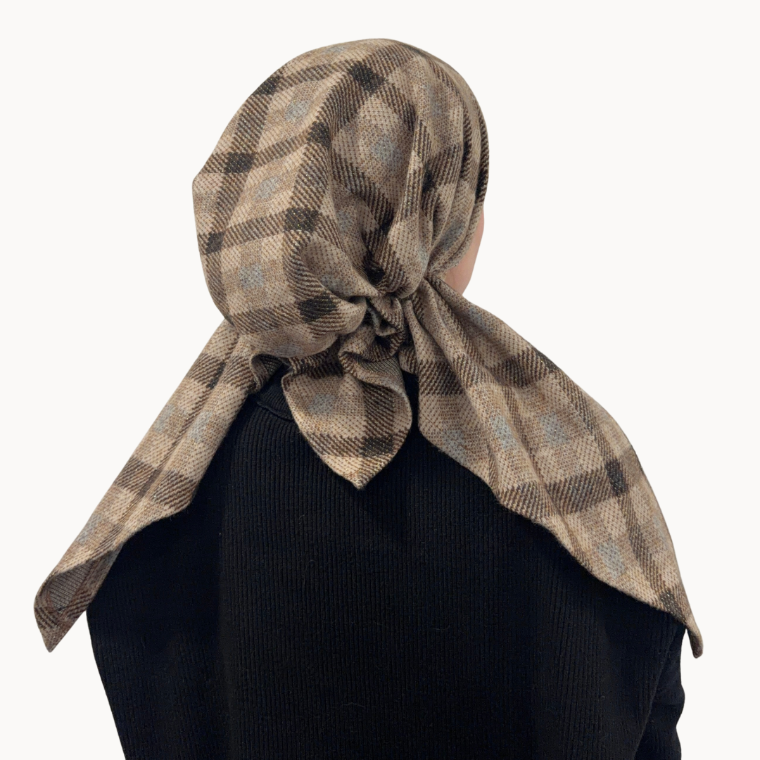 A beautifully woven plaid knit set on a warm beige background, featuring soft brown and muted blue tones with a subtle gold shimmer woven throughout. This fabric has a thicker, cozy weight with a soft feel, making it ideal for cooler days and added warmth. While comfortable, it is on the heavier side and may not be the best choice for those who are highly sensitive to thicker fabrics.