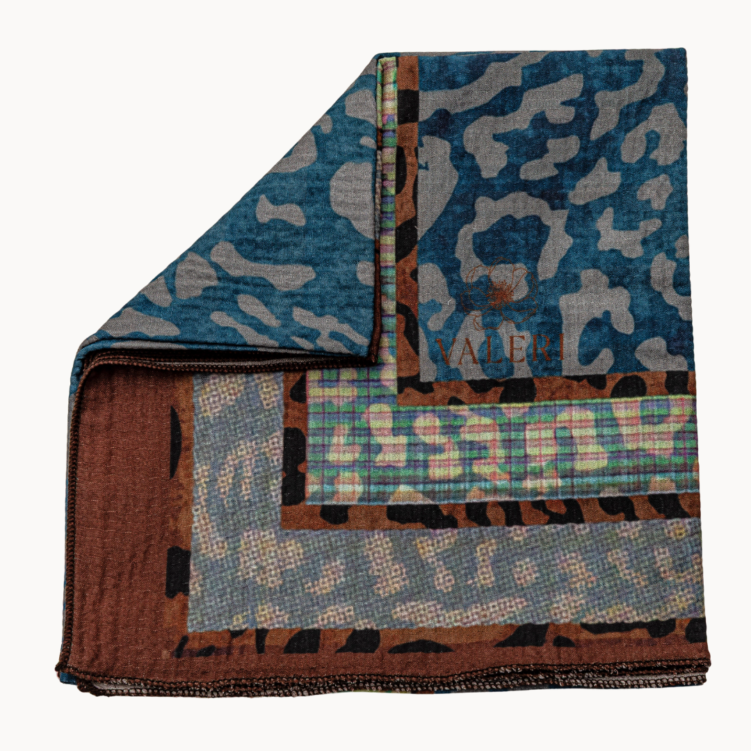 Layers of intricate borders frame a soft indigo leopard print for a bold yet refined look. Detailed, dimensional, and full of depth, this design mixes cool tones and subtle pattern work in a way that feels both classic and modern. Made on our new airy crinkle fabric with just the right amount of texture. Comfortable, lightweight, and perfect for all seasons.