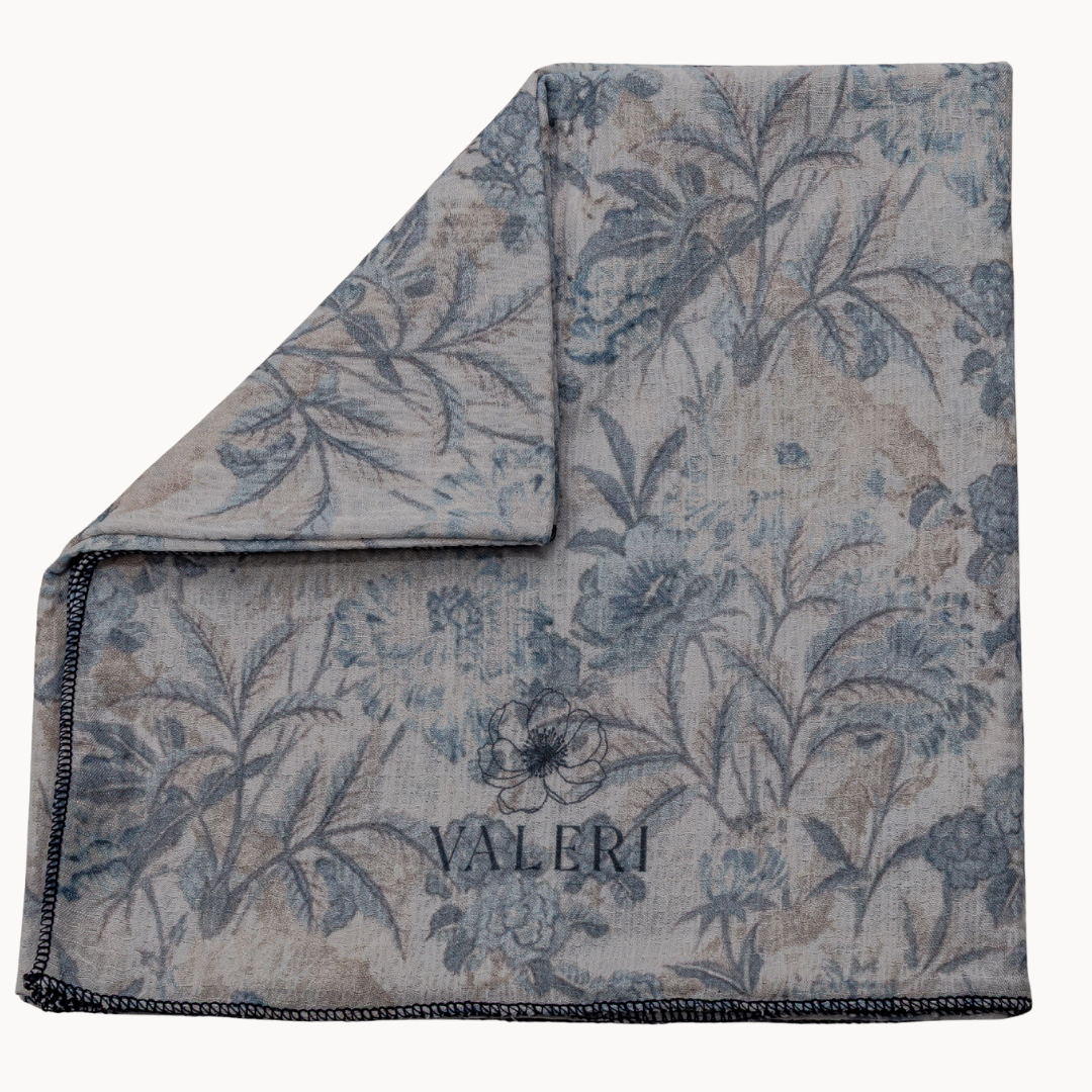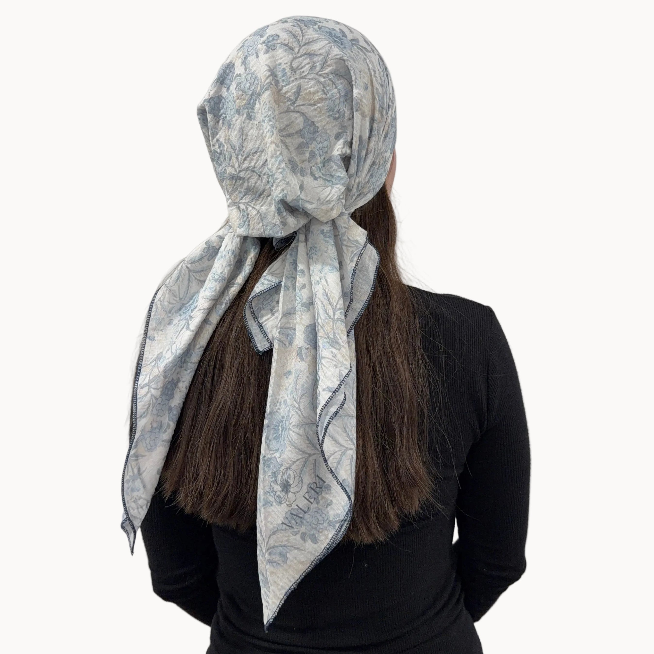 Soft powder blue and ivory garden florals in a delicate toile style on a white background. Made on our new airy crinkle fabric with just the right amount of texture. Comfortable, lightweight, and perfect for all seasons.