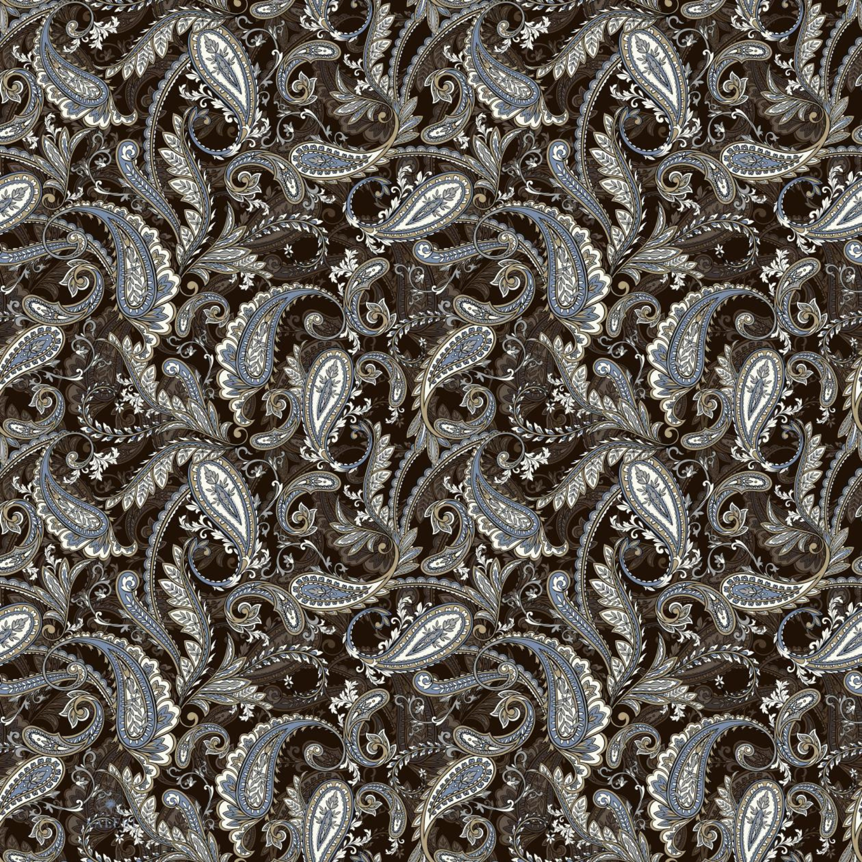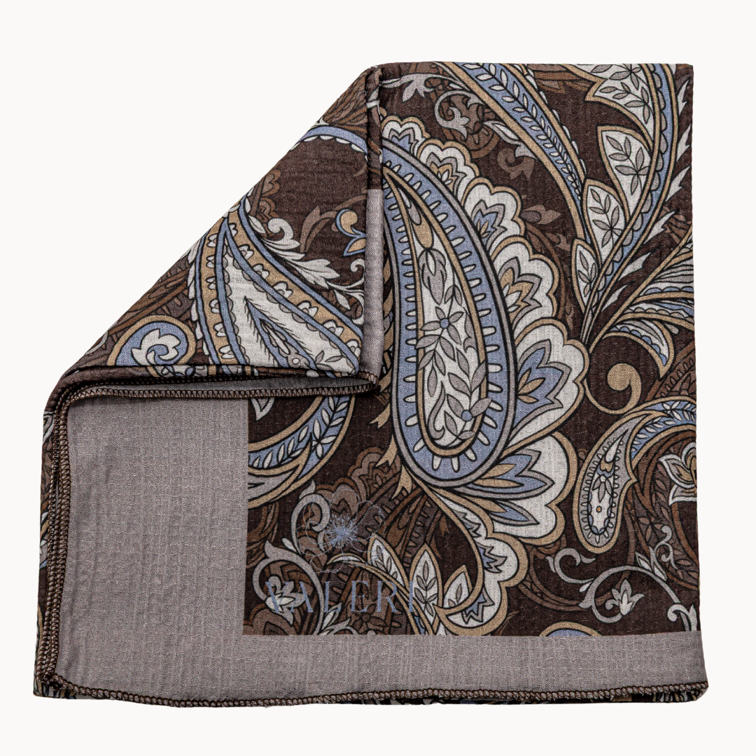 Classic pale blue and cream paisley on a rich chocolate background with a gray border. Made on our new airy crinkle fabric with just the right amount of texture. Comfortable, lightweight, and perfect for all seasons.
