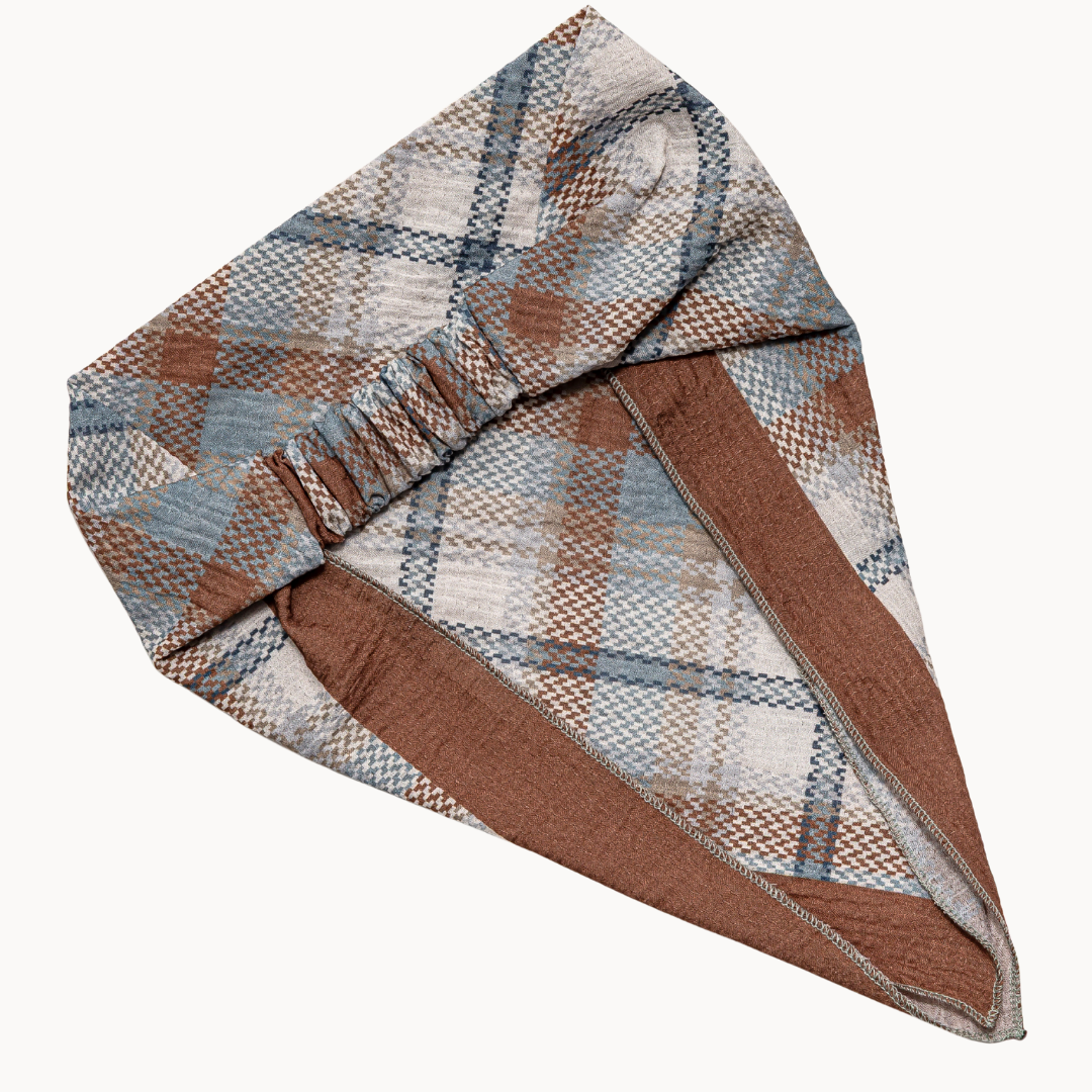 Soft birch-toned plaid in shades of blue, brown, and cream. Made on our new airy crinkle fabric with just the right amount of texture. Comfortable, lightweight, and perfect for all seasons.