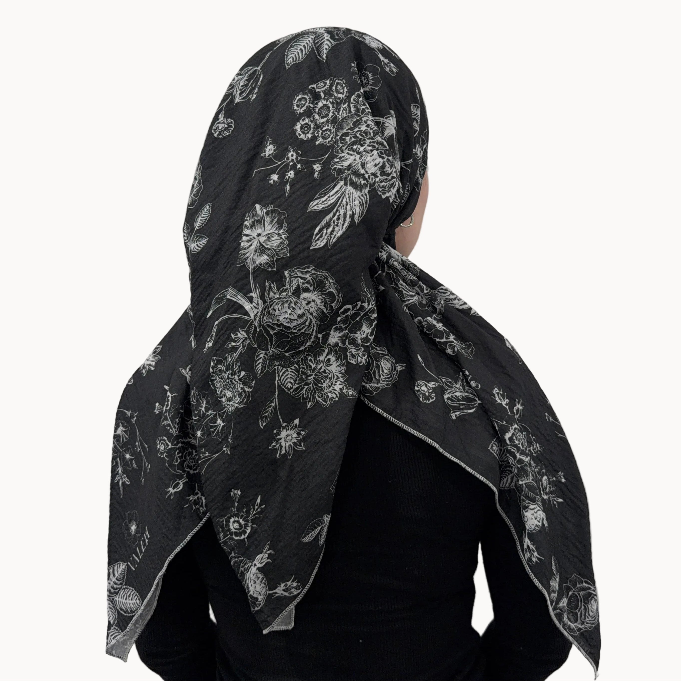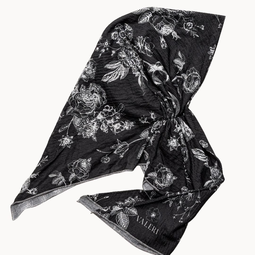 Intricate white floral scattered across a black backdrop, with a French Victorian elegance that feels both romantic and timeless.