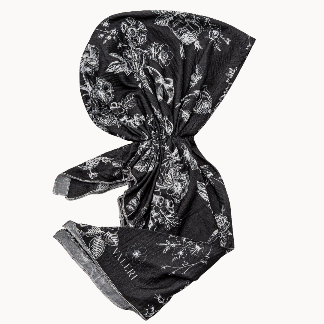 Intricate white floral scattered across a black backdrop, with a French Victorian elegance that feels both romantic and timeless.