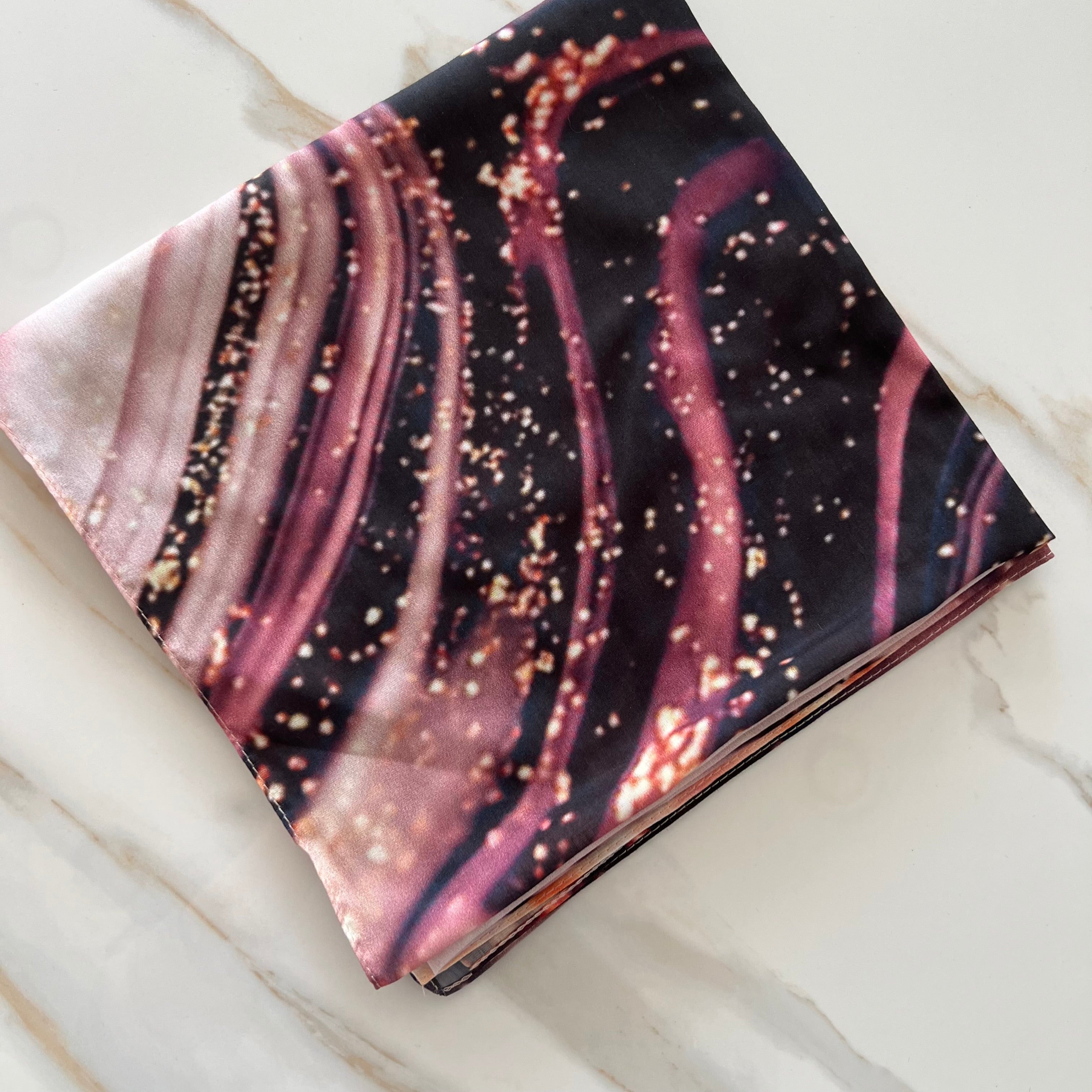 This lightweight headscarf features a stunning purple marble watercolor design, enhanced with the illusion of gold sparkles throughout. Its rich, vibrant hues and subtle shimmer add a touch of elegance and sophistication, making it the perfect accessory for any season.