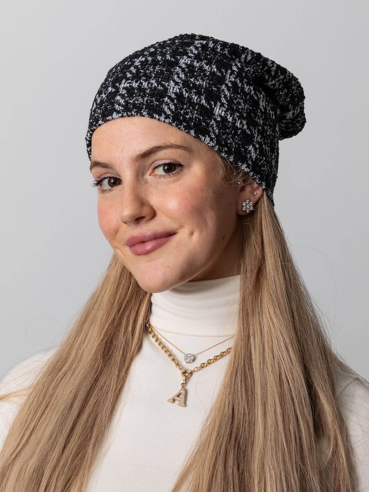 A soft, warm, and gently textured tweed boucle beanie with silver lurex detailing.