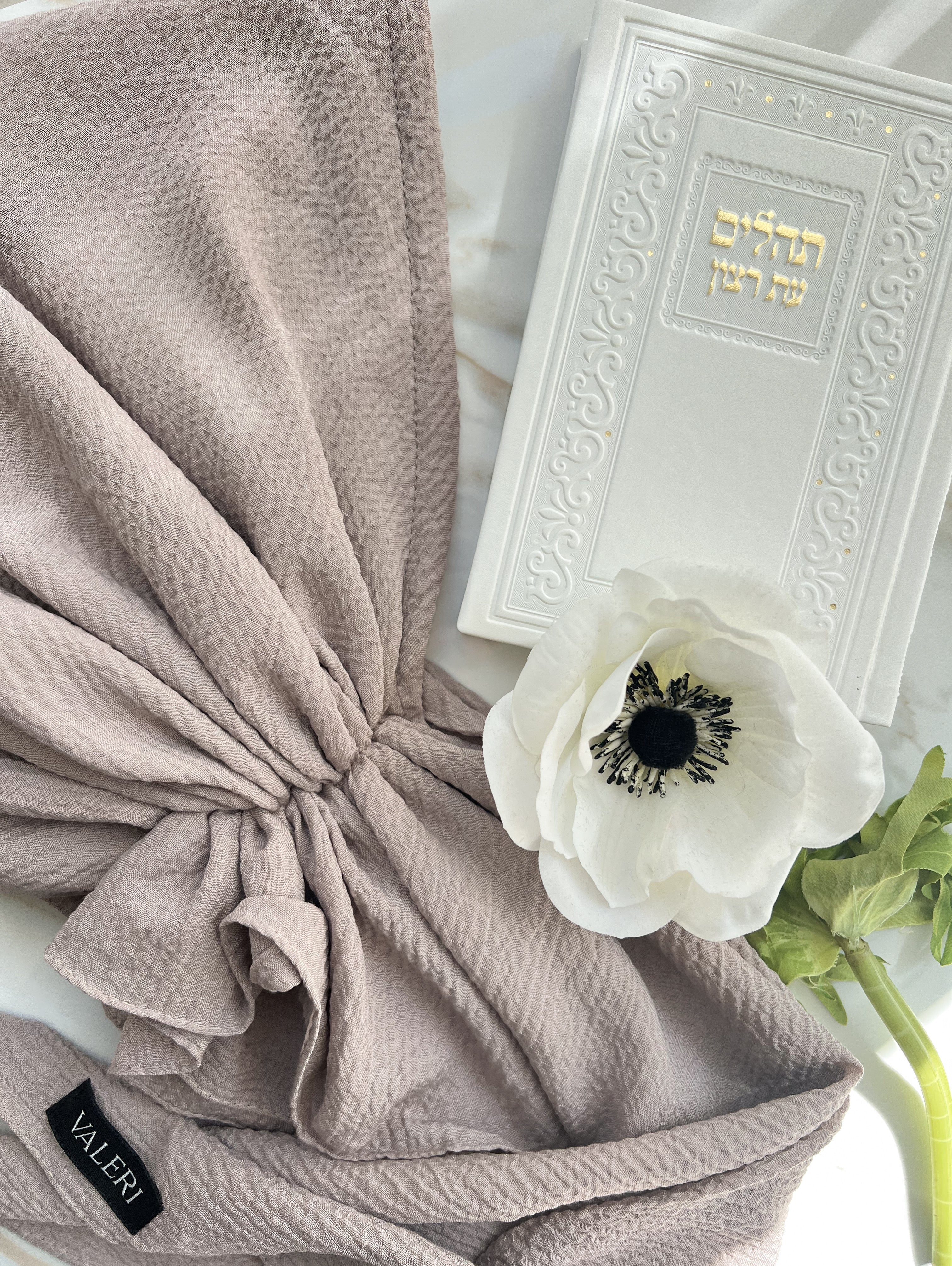 Our community’s absolute favorite — and for good reason. This scarf is crafted from the softest crinkle-textured fabric that drapes beautifully and adds natural dimension around the face. Inside, we’ve sewn in our signature velvet headband for a secure, slip-free fit, plus an adjustable toggle so you can customize the sizing to your comfort.